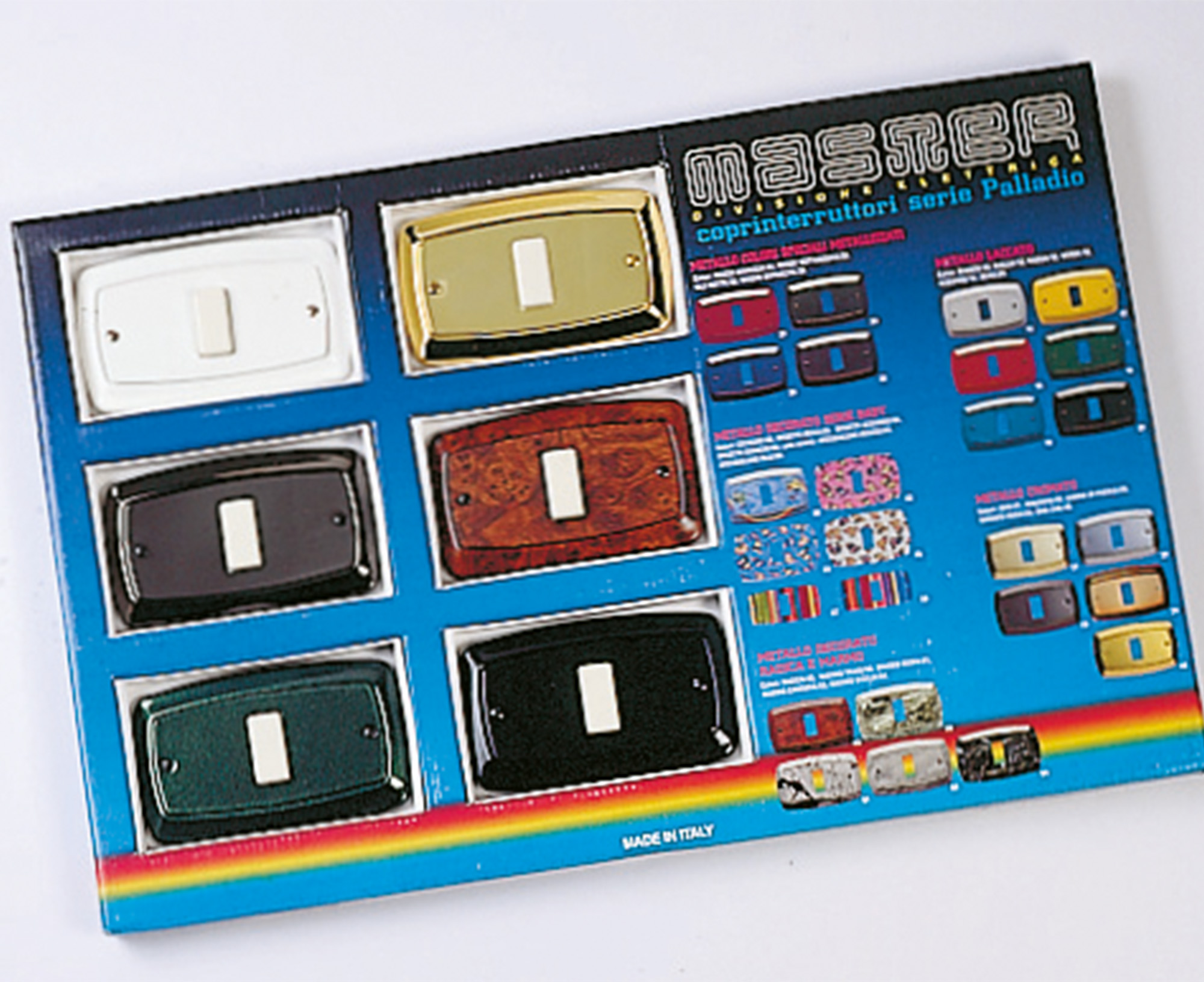Over the course of the ’80s, Master specialized in the production of mechanisms and switch-covers for residential and commercial series, gaining considerable know-how in product design and manufacture, in addition to gaining ground in international markets. The Venda/3000 series was joined by cover plates from the Bandiera, Palladio and Giotto lines, later followed by the 6000 series, and Modì and Junior/Construya lines.