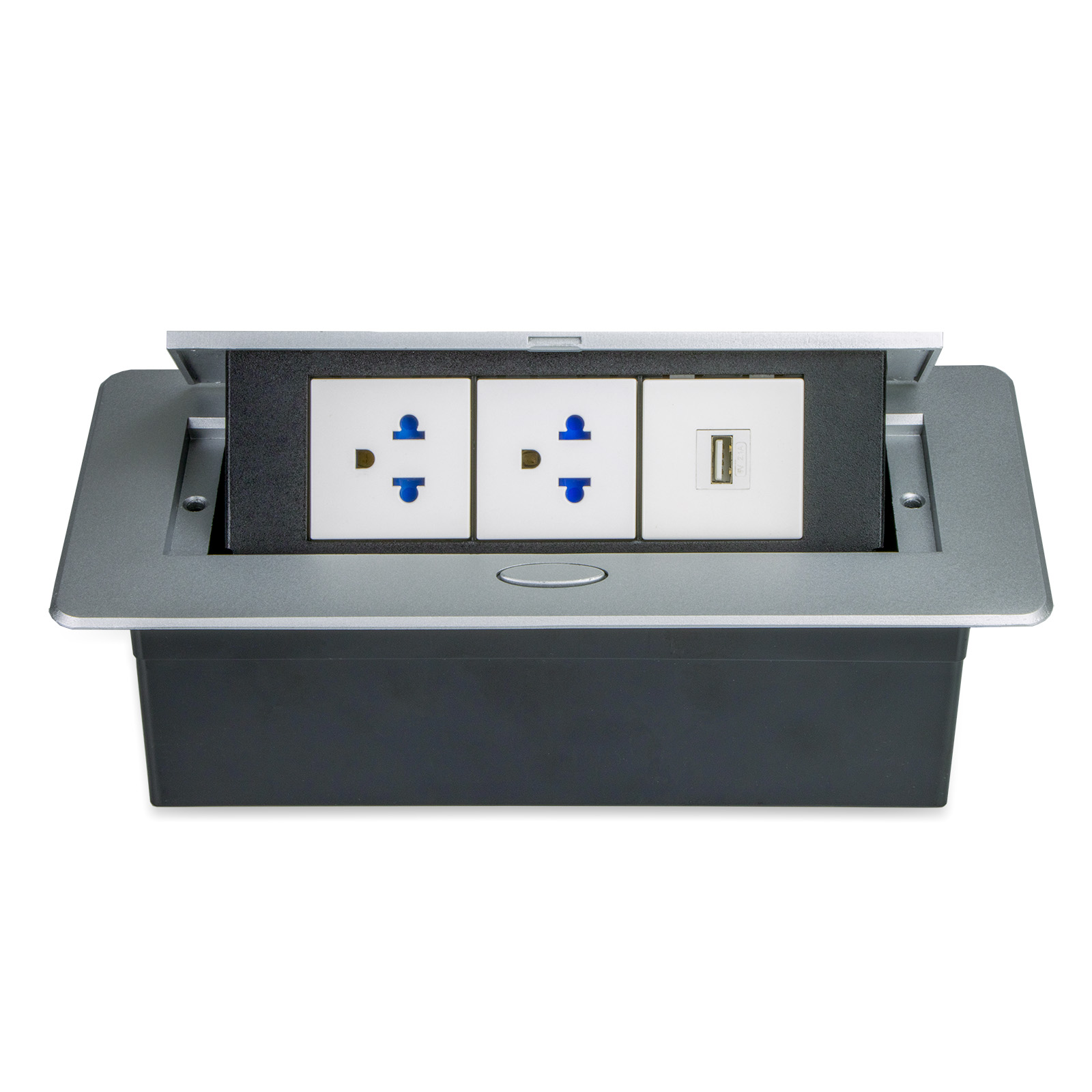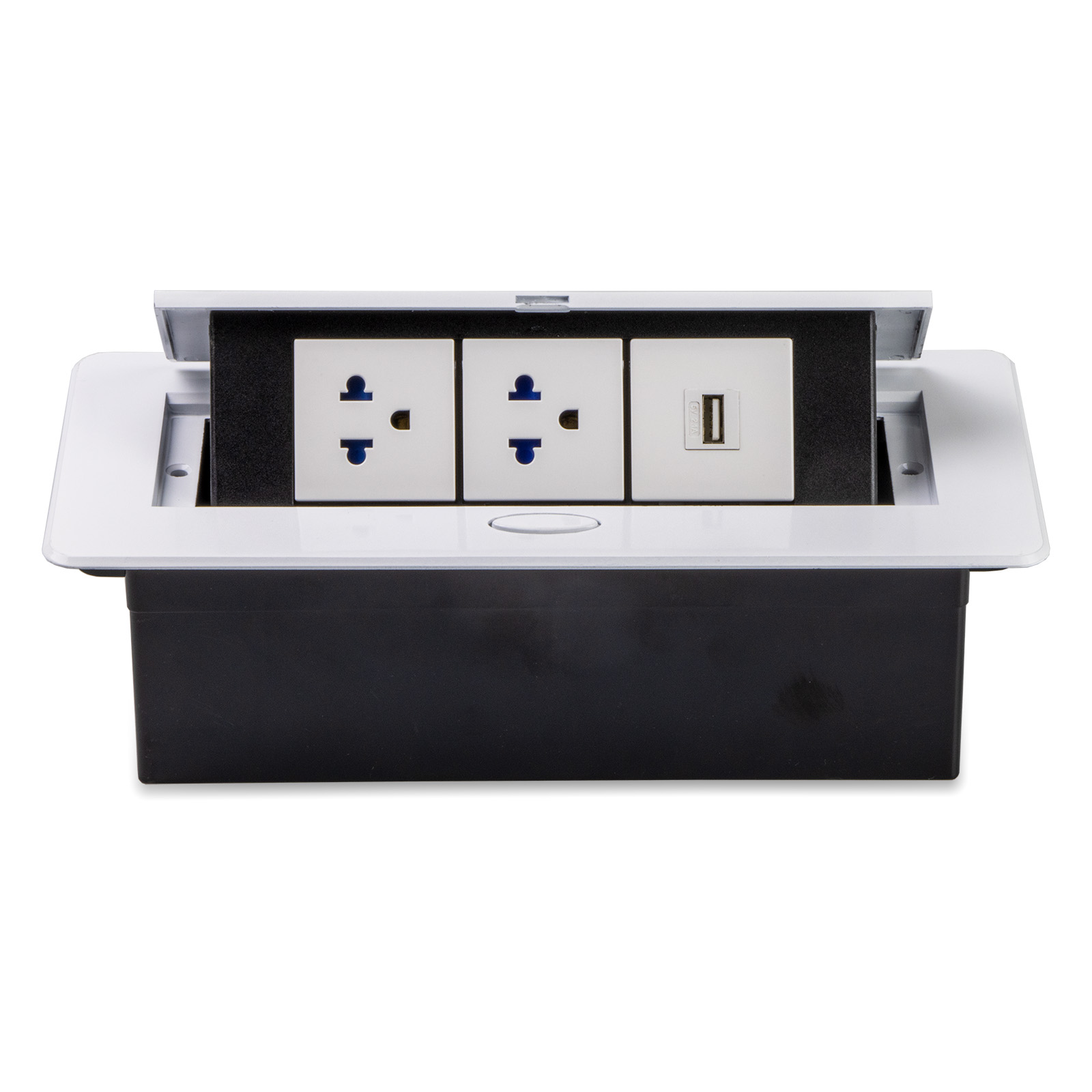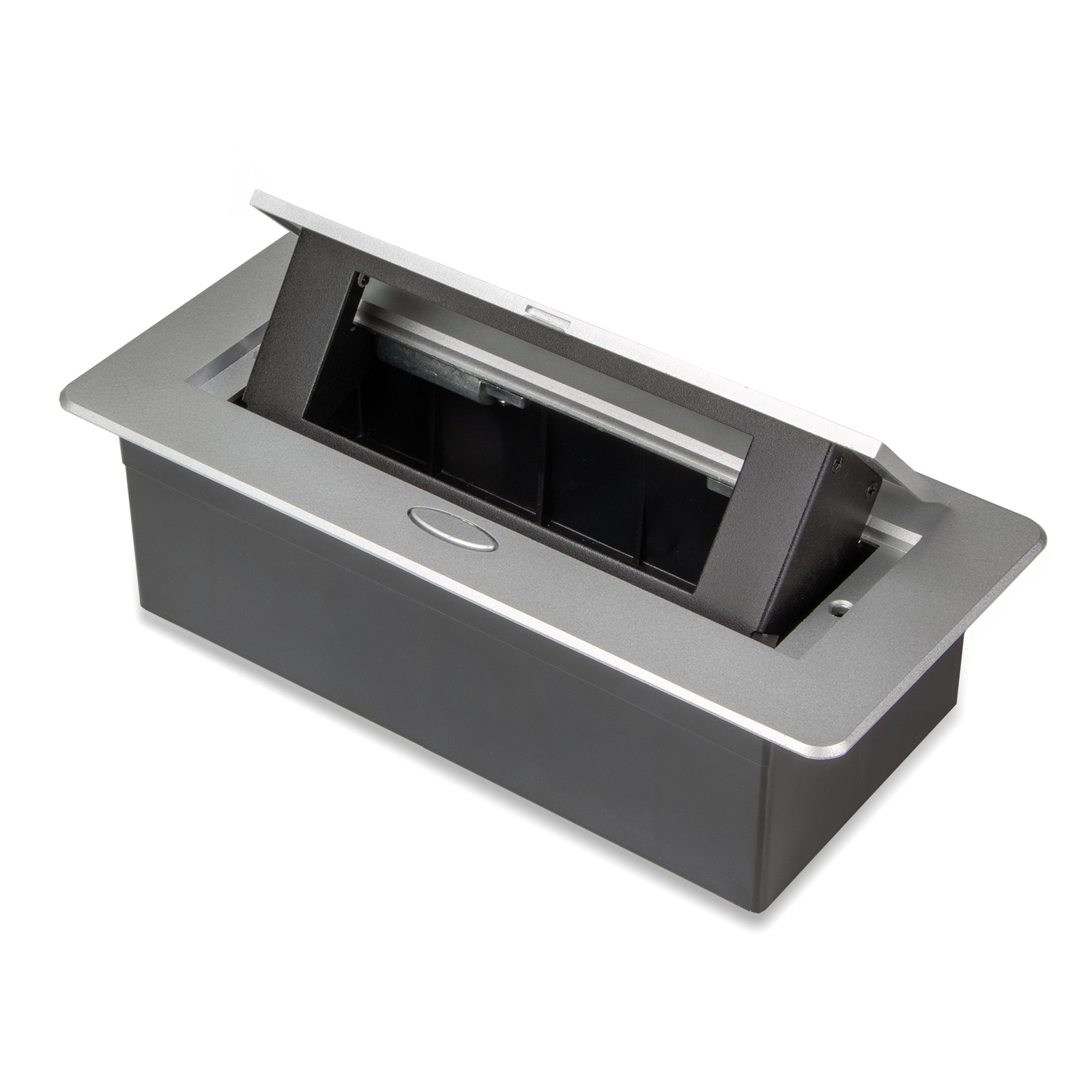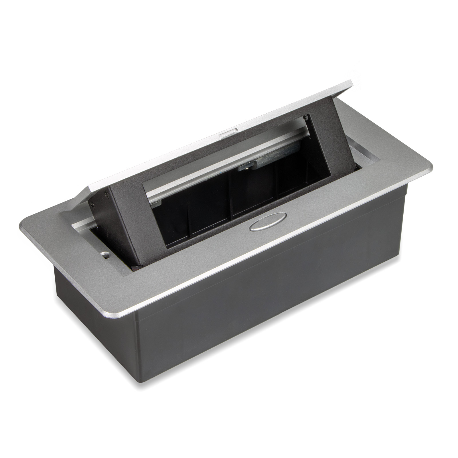 Master presents a new solution for concealed civil installation on tables, desks and custom-made furnishings. The new box with pop-up opening allows you to keep sockets and appliances hidden when not in use, thanks to the flat design that offers a thickness of only 3 mm from the recessed surface.